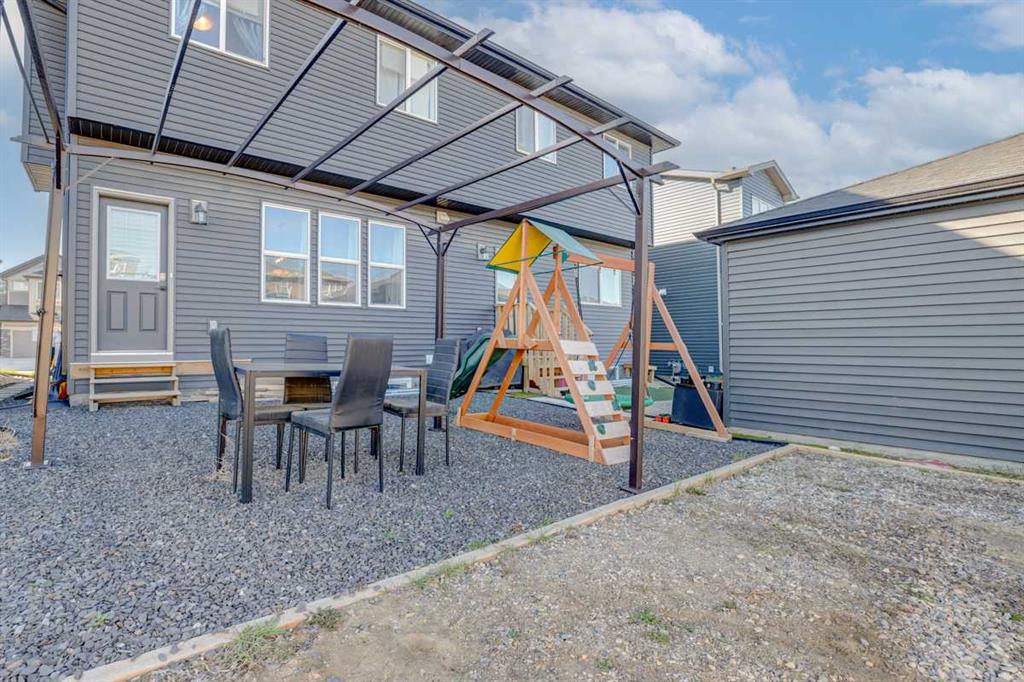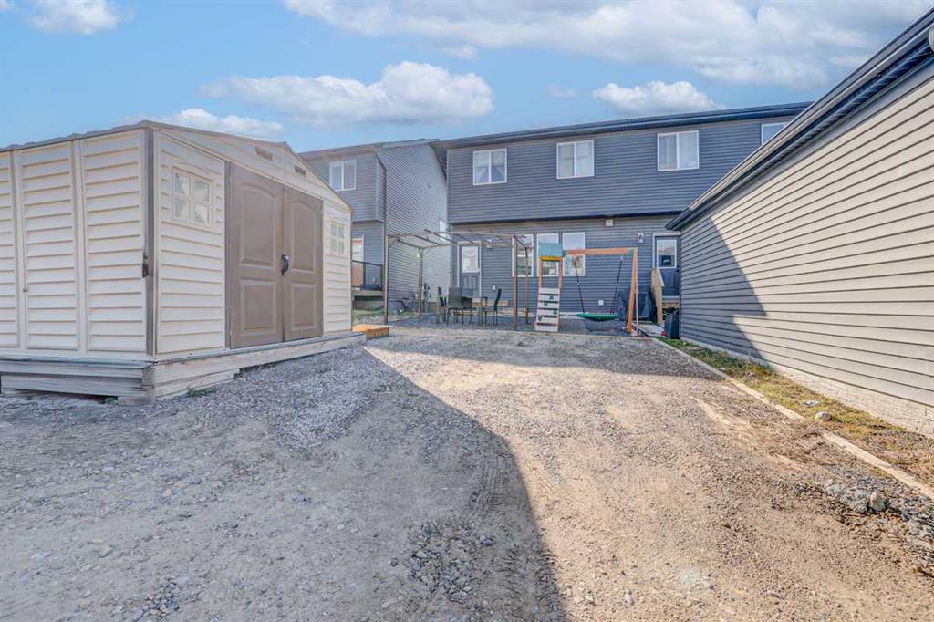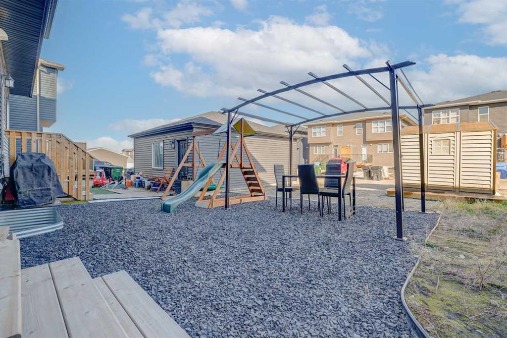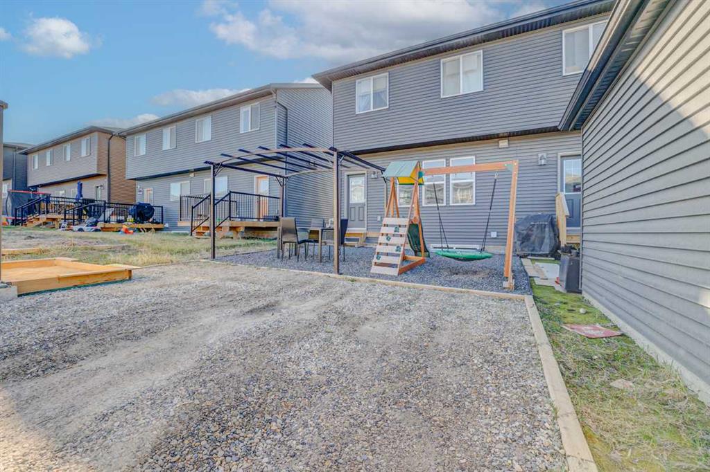 Welcome home to this beautifully designed semi detached home, complete with central air conditioning, in the sought after community of Legacy. The main floor open plan with its 9 ft ceilings & luxury vinyl plank flooring welcomes you to a spacious entry leading to the living room complete with a cozy fireplace , a dining area situated just off the kitchen with a huge centre island, stainless steel appliances with a gas stove and a pantry as well as a 2 piece bath. The upper floor consists of three bedrooms including a massive primary bedroom complete with a walk in closet and a 3 piece en suite, laundry room and a 4-piece bath. The completely developed basement with a separate entry from outside as well as from inside the home and has a large living area with a kitchenette, a bedroom area & 3 piece bath with a stacked washer/dryer. The front yard has a covered porch and is very low maintenance, and the back yard has a storage shed, gazebo & kids play area as well as a storage shed & a 2-car gravel-parking pad. This home offers easy access to walking trails, parks, schools, shopping and restaurants. Legacy is very family friendly and has many amenities to offer. Do not miss this incredible opportunity!