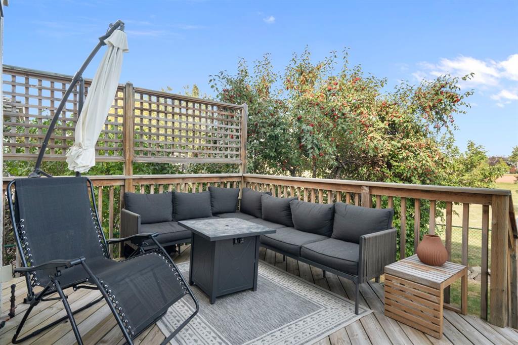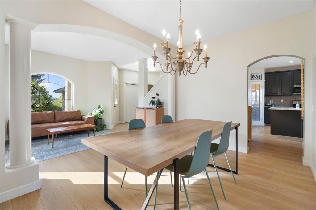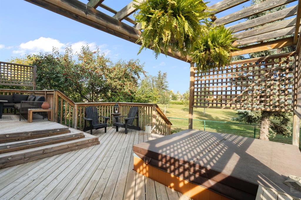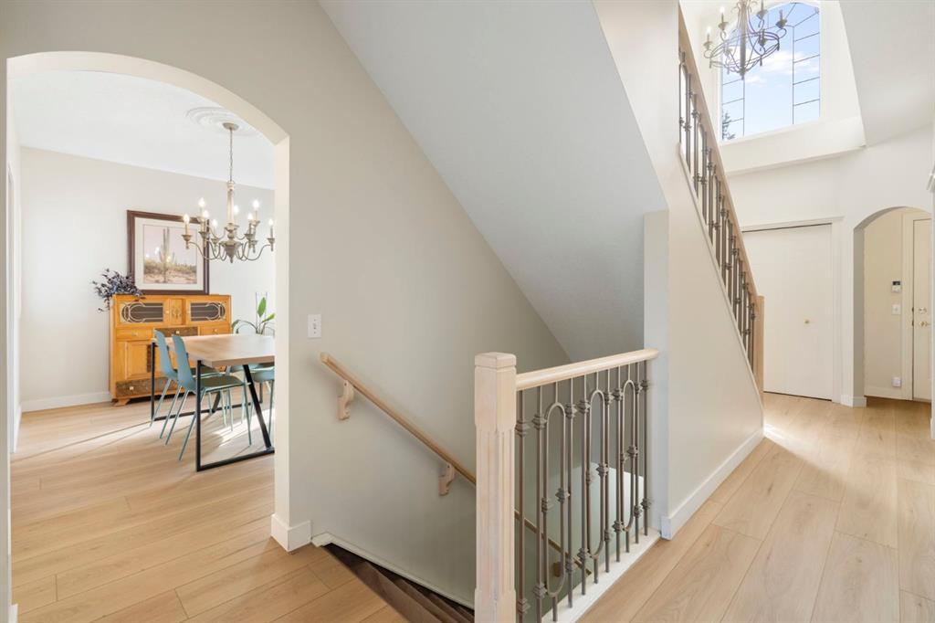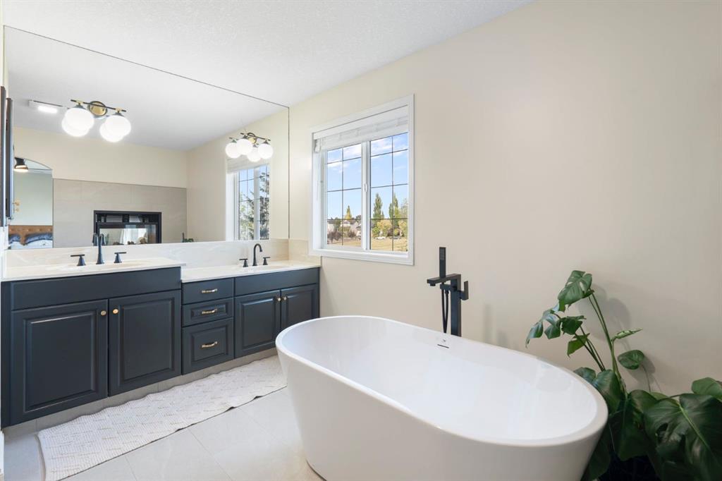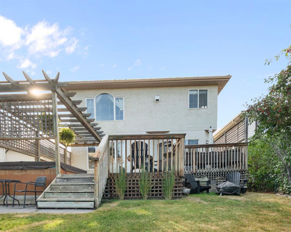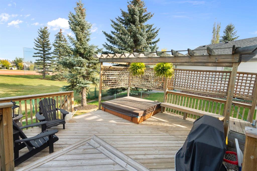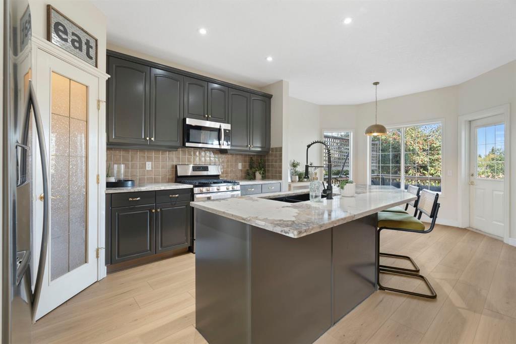 Welcome to this stunning 2,200+ sq. ft. home where timeless character meets modern updates. Elegant crown moldings, graceful archways, and custom built-ins add unique charm, while thoughtful renovations bring a fresh, contemporary feel. The heart of the home features custom quartz countertops, fresh paint, custom painted cabinetry, and brand-new lighting throughout. On the main level, new vinyl plank flooring adds style and durability, while the upper level is finished with plush, upscale carpeting for comfort. The primary suite showcases a brand new spa-inspired ensuite transformation, designed for luxury and relaxation. Multiple gas fireplaces enhance the warmth and ambiance, creating a welcoming atmosphere year-round. The spacious layout includes grand front living and dining rooms, a dedicated office, and oversized bedrooms perfect for families. Step outside to your tiered deck with a gazebo and hot tub, an ideal space for entertaining or relaxing. The backyard backs directly onto a park- no neighbours behind- while the front offers sweeping mountain views. Just one block from the Bow Valley ridge trails leading into Fish Creek Park and steps from a nearby playground, this home offers the perfect balance of nature and convenience. Nestled in a quiet cul-de-sac with welcoming neighbours, the location is truly ideal. You’ll also enjoy the convenience of 130th Avenue’s shopping, dining, and amenities just minutes away. This home is the perfect blend of modern upgrades, classic charm, and an unbeatable location!